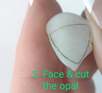Once it has been decided on what shape and way the opal is going to be faced to show its colours to their maximum brightness, the opal is cut down to its optimum shape and to the colour bar, with first a wet 180 diamond grit wheel then a 320 wheel. The higher the diamond grit number the less harsh the wheel is on the opal and the less it will take off with each stroke.