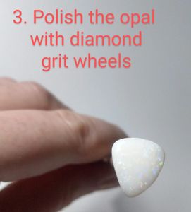 The opal in the picture is an Australian white opal from Coober Pedy, which is showing a spectrum of colours on ¾ of the sides of the rough rock. To help us with the examination we cut around the sides slightly with the wet 180 diamond grit lapidary wheel. We hope (and pray) for a thick band of visible vibrant colours and no large sand deposits. Sand is common in opal rough from Australia as it is made from silica mined from an ancient sea bed. It is incredible to think that some of the Australian, very dry and hot desert, outback used to be a sea.....mind blowing stuff! While lots of sand can make a great holiday it can be soul destroying in opal lapidary. It is definitely our nemesis when sand appears out of nowhere and then covers the spectrum of colours we were polishing, which disappear into dust as quickly and disappointingly as an an actual rainbow.