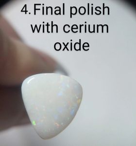After the scratches are superficial we move to the final polishing stage on the felt wheel, which we paint with water and cerium oxide, to give a super shiny polish on the opal cabochon gem.